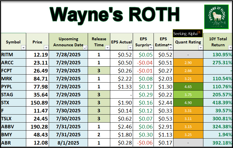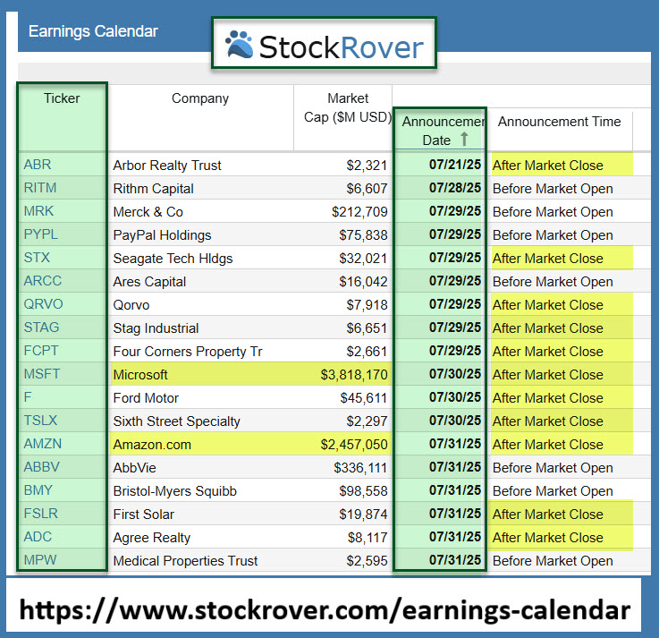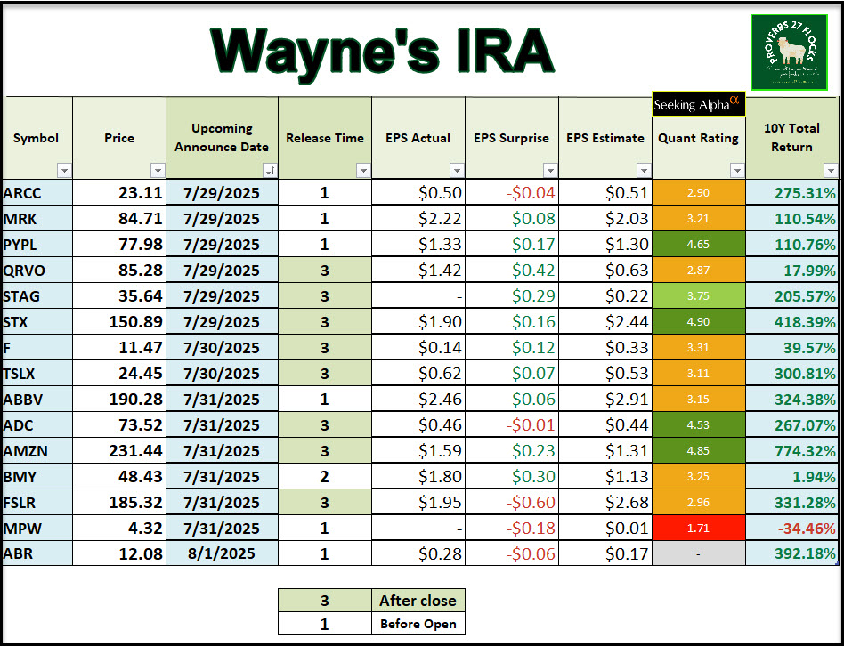 Because I use StockRover and this service is linked to our Fidelity Investments holdings, I can quickly see the earnings calendar for the upcoming week or even the following week or weeks. The following images show this week’s earnings dates and next weeks. Eighteen of our holdings are scheduled to announce earnings this week, and twenty-one are expected to announce earnings next week. Notice also that StockRover lets me know when earnings will be announced. I prefer to see earnings announced after the market closes, as this helps me see what is likely to happen when the market opens the following day.