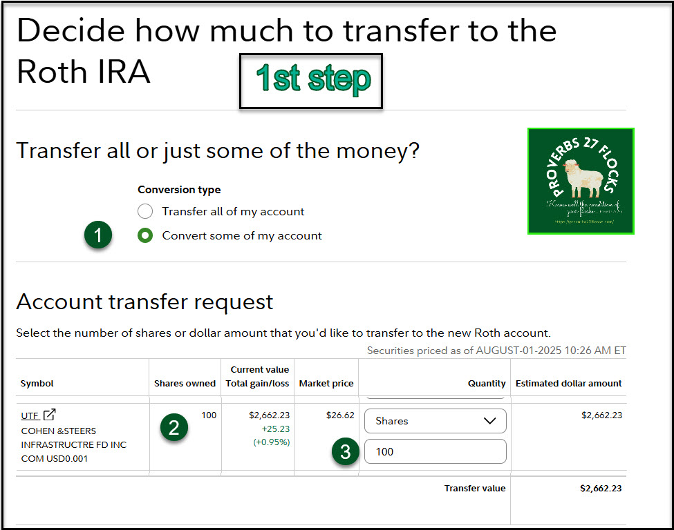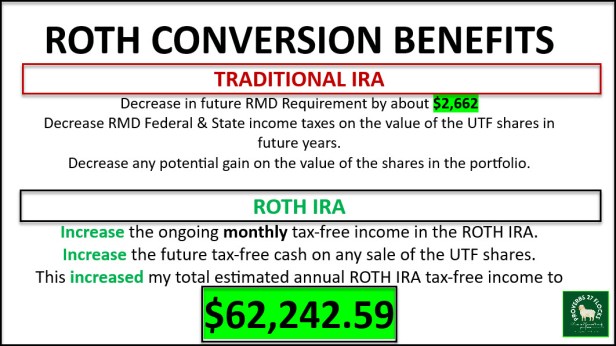 The second is that you have to consider where you are in age. If you don’t have to take RMDs yet, then it is easy. If the taxes you have to pay for withdrawals from your IRA make sense, convert the shares to the ROTH. If you have to take RMDs (like me) then you need to fulfill your RMD obligation before you do any conversions.