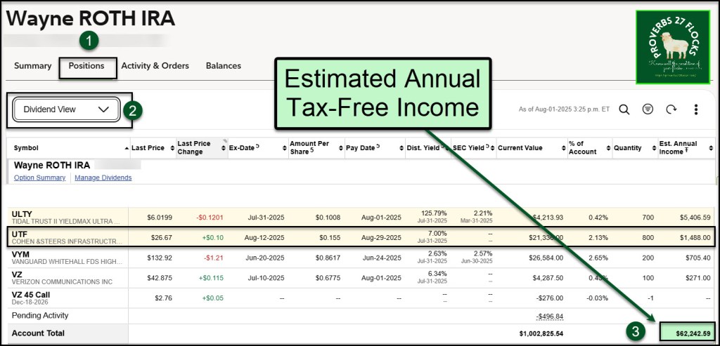 Let’s not forget that the income I make from selling covered call options in the ROTH IRA is also tax-free. That is a bonus. You don’t have to do this, but it can create a lot of income. Look at it this way: my tax-free income from dividends and options trades over the twelve months (assuming no dramatic changes to my holdings) will easily reach $100K in 2025.