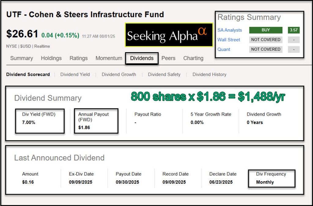 The most obvious thing is that the 100 shares increases the ROTH’s ongoing monthly tax-free income. Because the annual estimated income from one share is $1.86, I have added $186 in tax-free income to our income stream. I already had 700 shares of UTF in my ROTH, so this brings the total UTF monthly dividend to $128. That is enough to cover our PureTalk cell phone bill (a total of $39.20 for two phones) and our Spectrum internet service ($49.99), leaving enough for a tank of gasoline ($38.81).