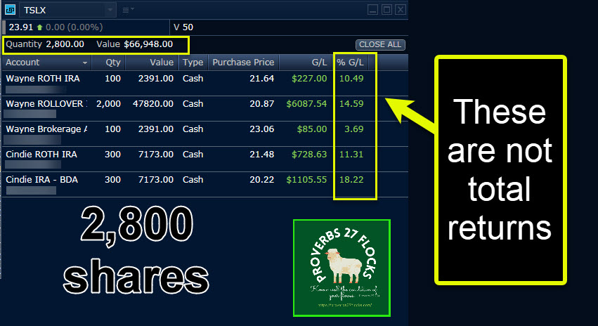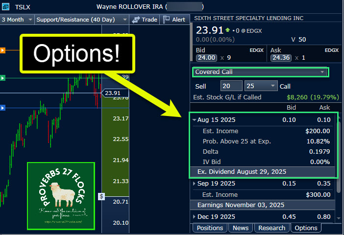 I can also trade options on my TSLX shares. I hesitate to do so, as I don’t want to run the risk of seeing the price of the shares skyrocket. It is, however, another way to create additional income. I could always buy the shares again if they were called away.