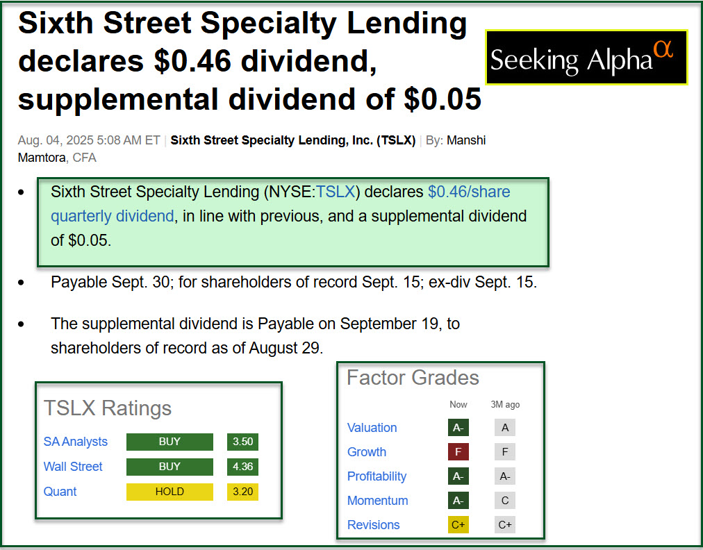 The good news keeps rolling in for our 2,800 shares of TSLX. “Sixth Street Specialty Lending (NYSE:TSLX) declares $0.46/share quarterly dividend, in line with previous, and a supplemental dividend of $0.05. Payable Sept. 30; for shareholders of record Sept. 15; ex-div Sept. 15. The supplemental dividend is Payable on September 19, to shareholders of record as of August 29.” – SEEKING ALPHA