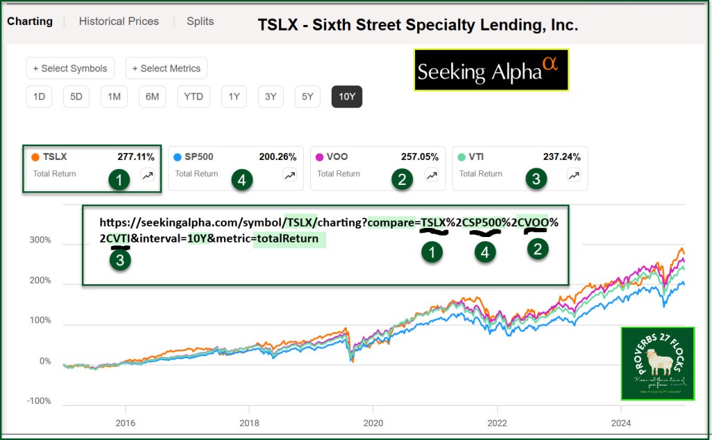 TSLX and VOO/VTI https://seekingalpha.com/symbol/TSLX/charting?compare=TSLX%2CSP500%2CVOO%2CVTI&interval=10Y&metric=totalReturn