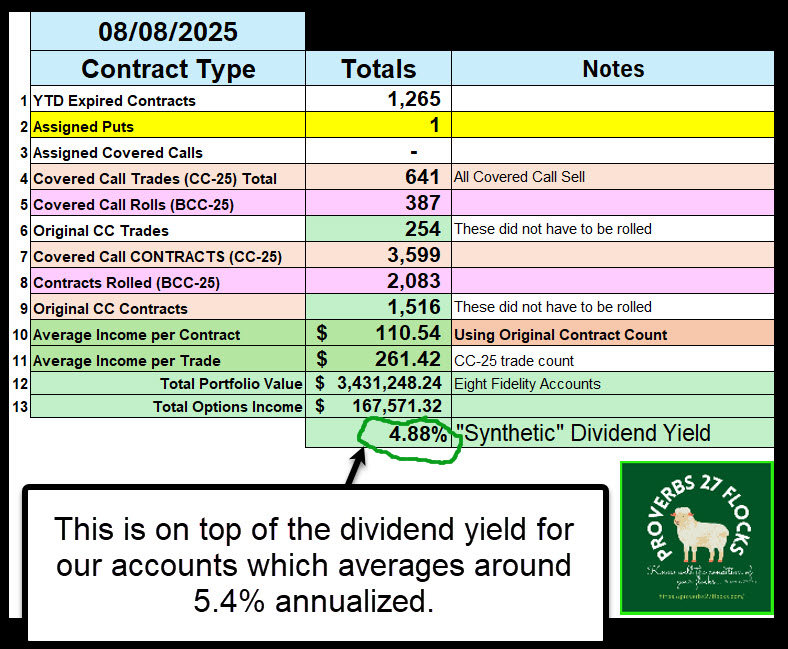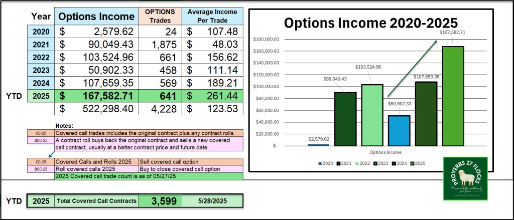 Before we dive into the process, you deserve to know if my process works. YTD options income is now $167,582. That is a synthetic dividend yield of 4.88%. Now ask yourself this question: “If I get a dividend yield of 3% on my shares and can add another 4% as a “synthetic” dividend (option income), would I take it?” Here are some images from my current results for 2025.