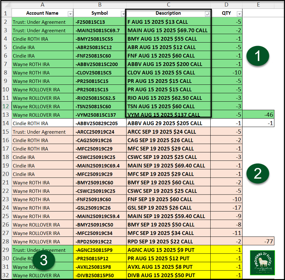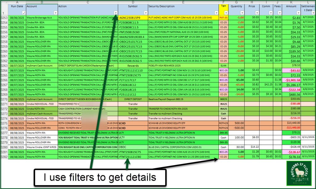 You may be wondering “How did Wayne create this spreadsheet?” It is a bit of work to get it set up initially, but then it becomes a template for future weeks. The data is easy: Just download your positions and sort them by the SYMBOL. All options contracts start with a dash, so they will sort together. Then, keep only those rows and turn on filters. It is easy to filter Column “C” for “AUG 15 2005” or any other date like “SEP 19 2025.”