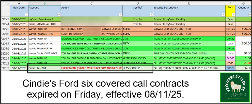 Sometimes the list is long and sometimes there are no expired contracts. On Friday Cindie’s six Ford “covered call contracts” expired. She keeps the money she received for her contracts, and she keeps her 600 shares of Ford stock. This is good news, as the next Ex-dividend date is 08/11/2025 (today!) so she will also get the fifteen cents per share dividend on the pay date: September 2.