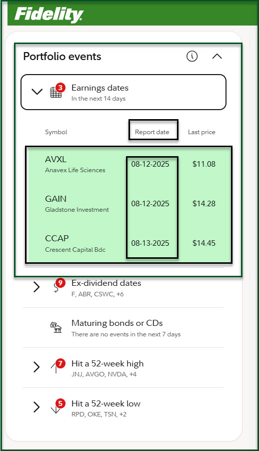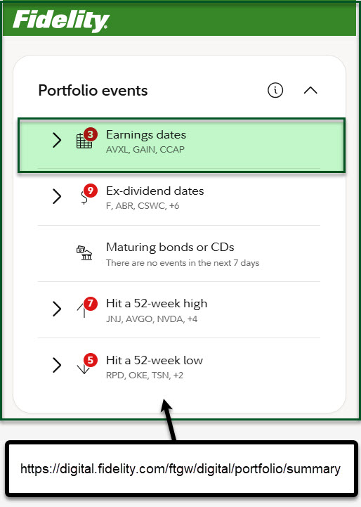 However, it is also possible to see a bit of information on the Fidelity Portfolio Summary Page in a box of choices called “Portfolio Events.” By clicking the right arrow you can see some of the information. Unfortunately, Fidelity’s view does not give the details you can see on StockRover, but it is a start. The Word template I use always forces me to review and consider the earnings date before I do an option trade. Also, Fidelity’s ATP shows me the earnings date in Trade Armor, so I don’t have to dig to see this.