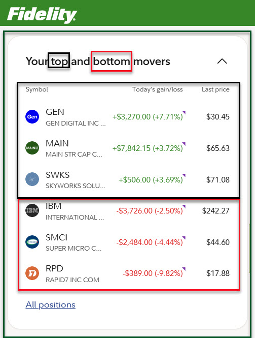 At around 9 AM (CST) I look at the main Fidelity Portfolio Summary Page for a box that is called “Your Top and Bottom Movers.” The following image shows the top movers were GEN, MAIN, and SWKS. The bottom movers were IBM, SMCI, and RPD. It just so happens that I have open covered call options contracts and one “cash covered put” option on these holdings.