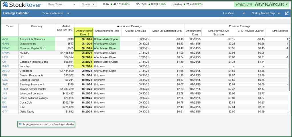 Because I care about earnings dates, I always review the stocks I own to see if they are announcing earnings. The easiest way to do this is to use StockRover’s “Earnings Calendar”.