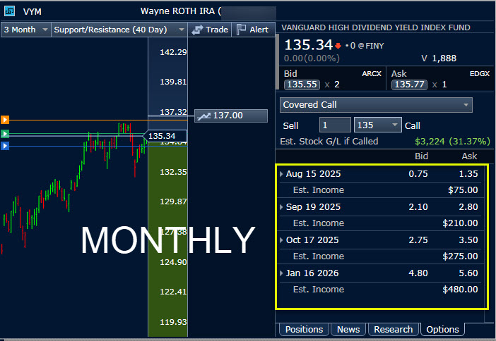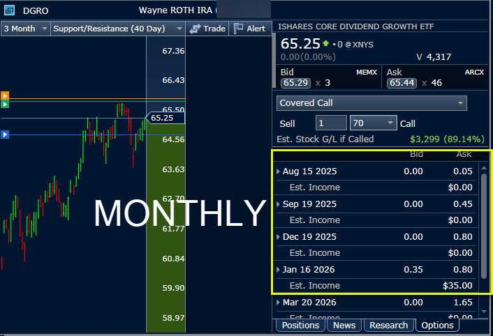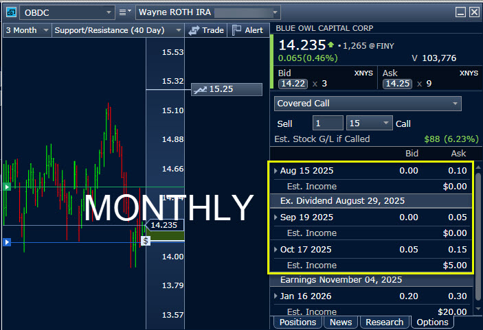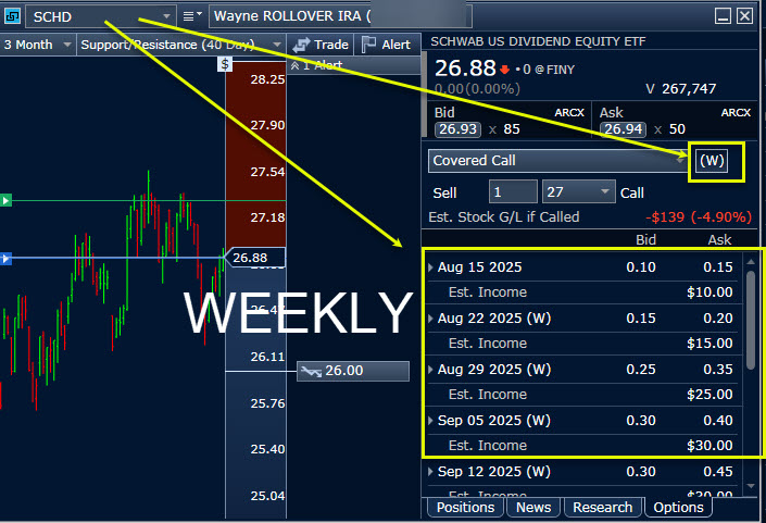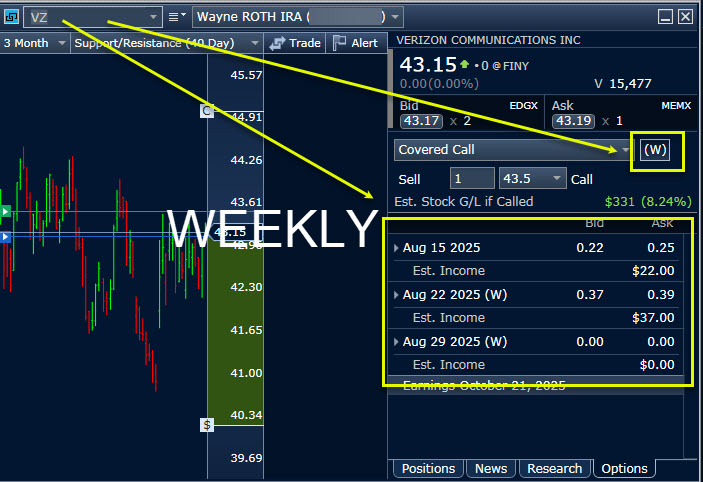 2. Weekly Options! Secondly, it is best to pick stocks and ETFs that have weekly options. Some only have monthly options that expire on the third Friday of each month. So, for example, SCHD is an ETF that trades weekly options. However, DGRO only trades monthly options. The more trades you can do (weekly) the more potential income you can receive. Stocks like VZ (Verizon) have weekly options but investments like OBDC (Blue Owl Capital) only have monthly options.
