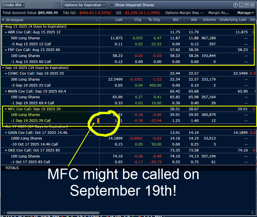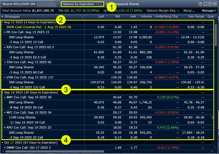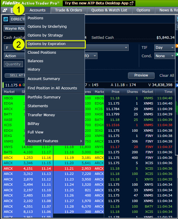 I spoke about using StockRover and a “Portfolio Events” section on the Fidelity website but I neglected to mention another valuable tool that requires very little time or effort. The other way is to check for expiring contracts within Fidelity’s Active Trader Pro (ATP). The only downside is that it is only one account at a time. The upside is that options that might be called are highlighted with an orange rectangle next to the option contract. Here are some images to help you navigate to this functionality.