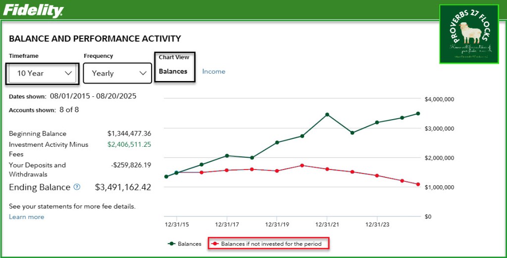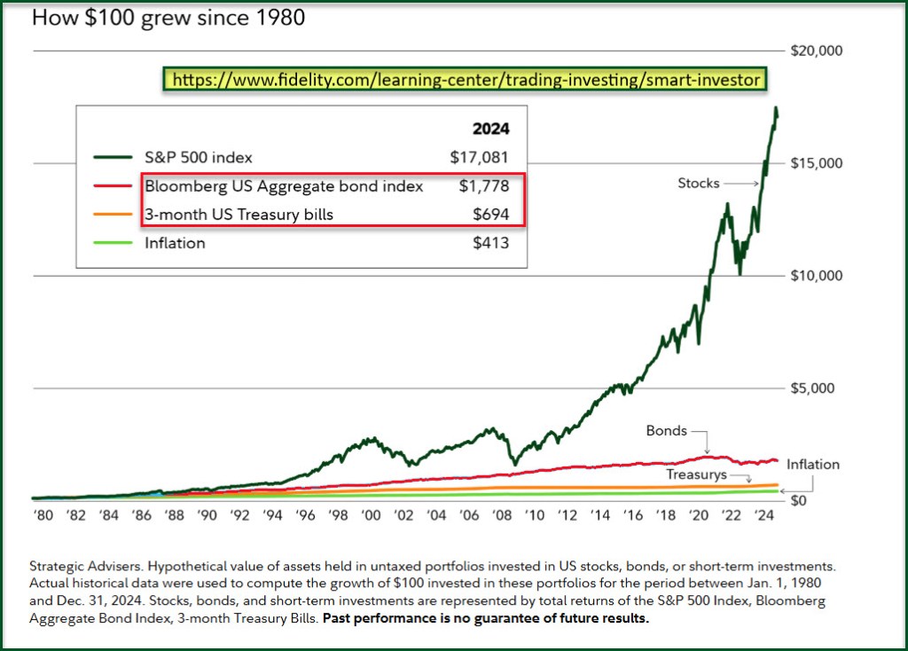 Most people understand pictures of numbers rather than numbers. This is especially true if you are looking at numbers over time. It is difficult to “see” the changes in a table of numbers, but a chart of those same numbers can be most illuminating. Today’s post covers four “Lessons For Investors” in picture format. Each one informs me of my optimal investing behaviors. Some of these images were captured from the Fidelity Learning Center.