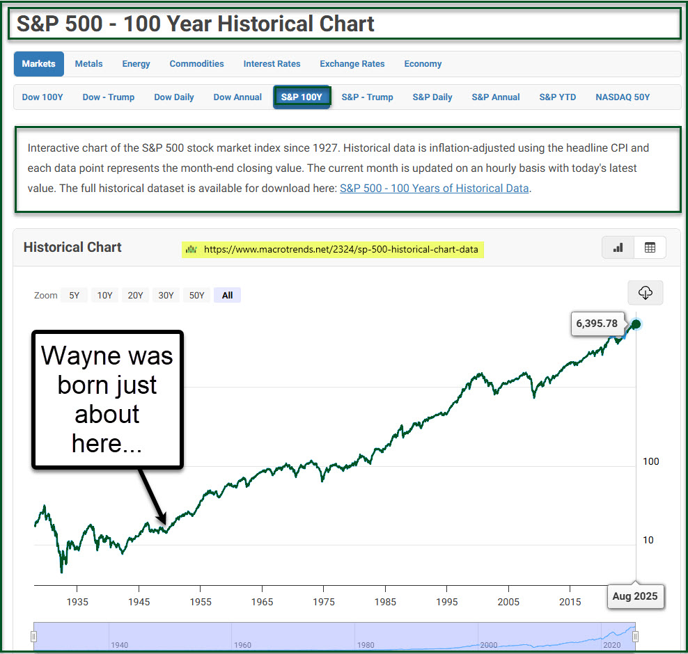 Look at the year Wayne was born. Then look at the S&P 500 today. The line is jagged. But there is a trend, and it informs my investment decisions.