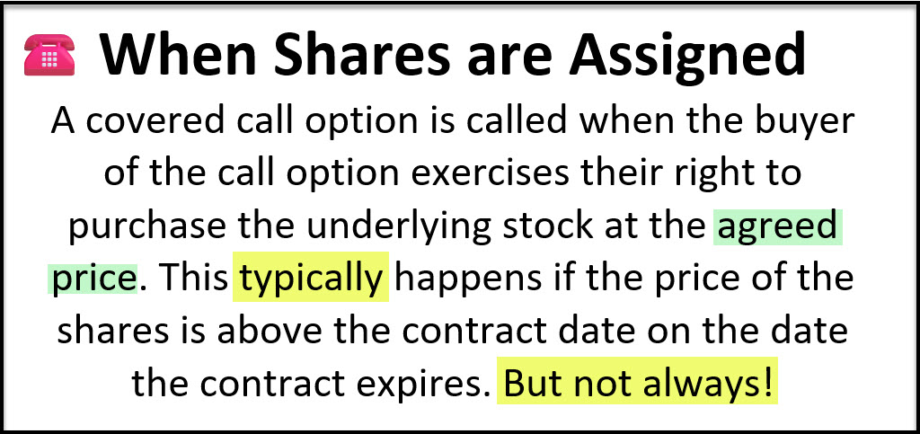 A covered call option is called when the buyer of the call option exercises their right to purchase the underlying stock at the agreed price. This typically happens if the price of the shares is above the contract date on the date the contract expires. So, for example, if the share price this Friday is $40, and the contract price was $38, then the buyer of my call option will “call” for my shares, and I have to sell them. That is the contractual agreement.