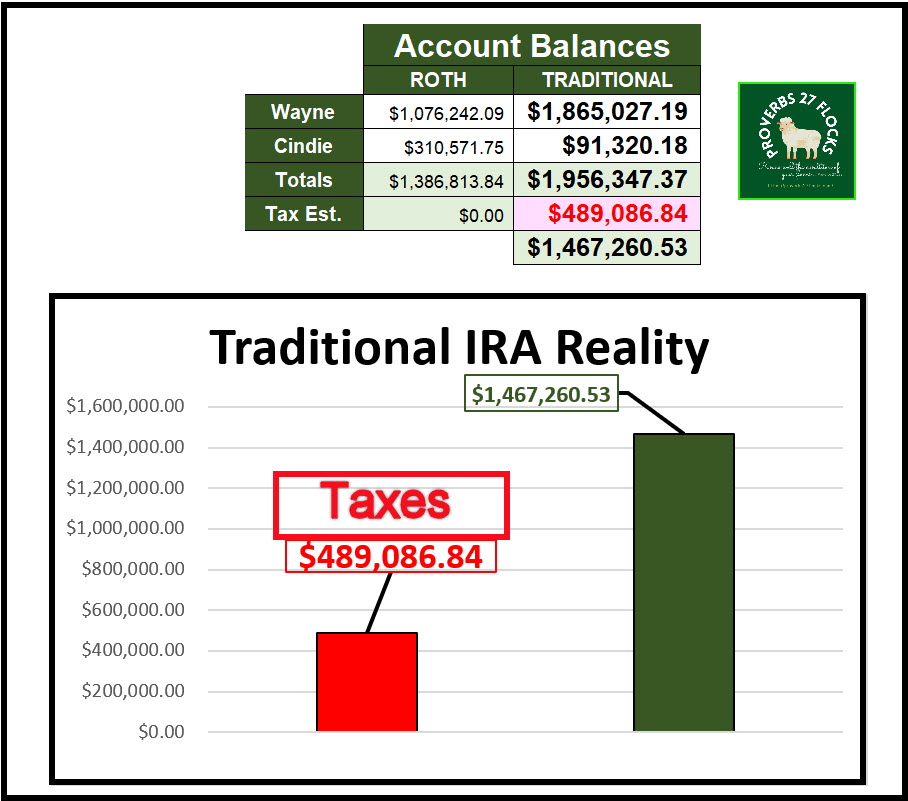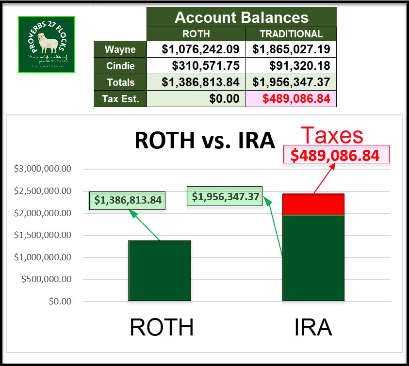 The income taxes on the traditional IRA will be a huge burden for our heirs. That is another reason to reduce the size of our IRAs. We want the specified charities and our children to get the inheritance with minimal taxes taken from the assets that remain.
