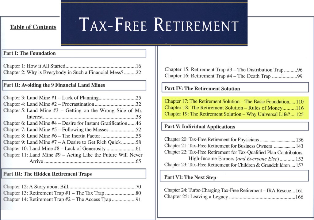 I recently ordered a used copy of Patrick Kelly’s book. The idea of a “tax-free” retirement certainly sounds great. The downside of Kelly’s book is that he really spends most of his time talking about the basics. Chapters 3-11 cover obvious “Financial Land Mines.” At least to me these were obvious.