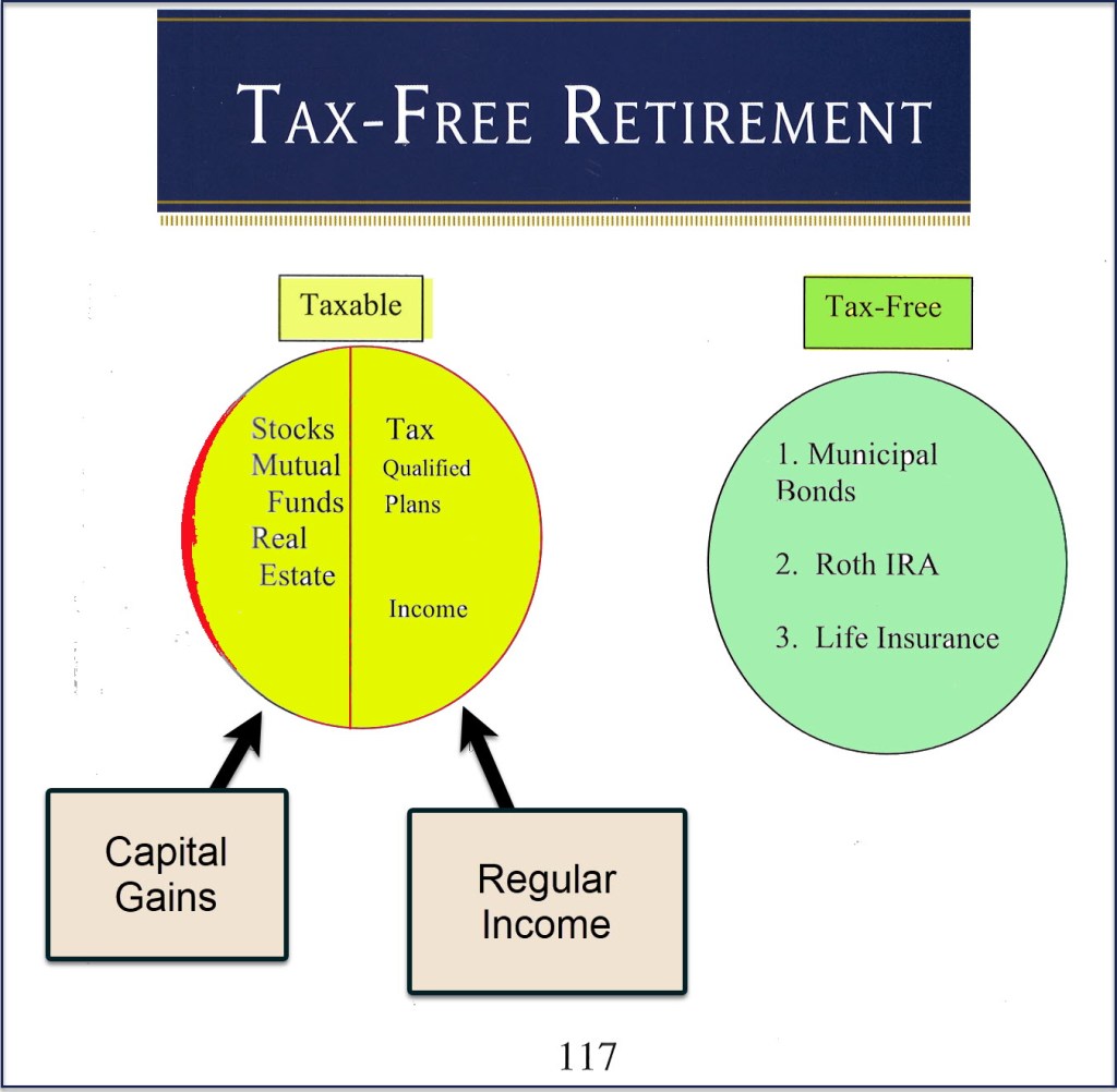 He correctly rejects the municipal bond idea. On page 118 he wisely states, “I disregard number one in the tax-free pot, municipal bonds, because over time they do not return enough nor provide the proper diversification to build a sufficient nest egg for retirement. So, by eliminating number one, we are left with numbers two and three.” – Tax-Free Retirement.