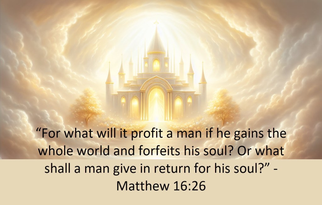 Jesus also helped with the picking dilemma: “For what will it profit a man if he gains the whole world and forfeits his soul? Or what shall a man give in return for his soul?” – Matthew 16:26 The ROI equation is regarding what a man will give in return for his everlasting soul.