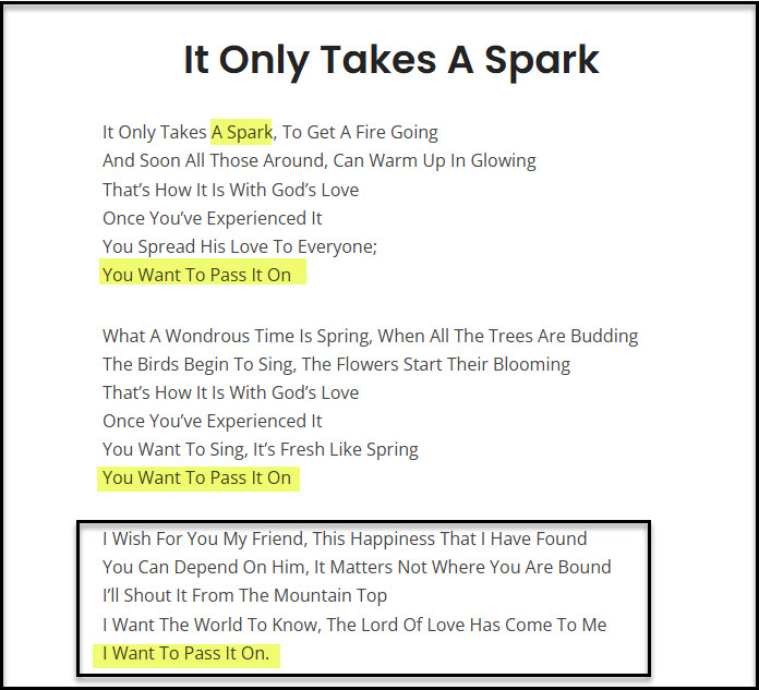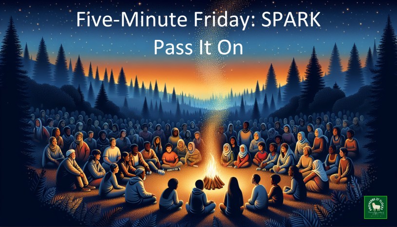 Today’s word, “SPARK” reminded me of a song from the 1970’s: Pass It On. One of the singers I also remember is Evie Tornquist. (Tornquist is ranked as the 39,138th most popular family name in the United States with an estimated population of 729. Not too many have that name!)