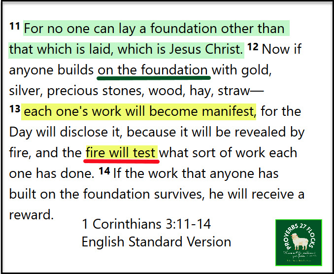 “For no one can lay a foundation other than that which is laid, which is Jesus Christ. Now if anyone builds on the foundation with gold, silver, precious stones, wood, hay, straw—each one’s work will become manifest, for the Day will disclose it, because it will be revealed by fire, and the fire will test what sort of work each one has done. If the work that anyone has built on the foundation survives, he will receive a reward.”