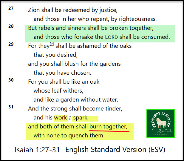 “Zion shall be redeemed by justice, and those in her who repent, by righteousness. But rebels and sinners shall be broken together, and those who forsake the Lord shall be consumed. For they shall be ashamed of the oaks that you desired; and you shall blush for the gardens that you have chosen.
