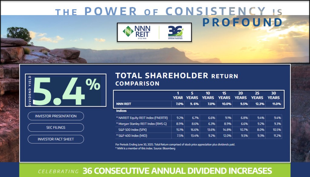 NNN invests in high-quality properties subject generally to long-term, net leases with minimal ongoing capital expenditures. As of June 30, 2025, the Company owned 3,663 properties in 50 states with a gross leasable area of approximately 38.3 million square feet and a weighted average remaining lease term of 10 years. NNN is one of only three publicly traded real estate investment trusts to have increased annual dividends for 36 or more consecutive years.