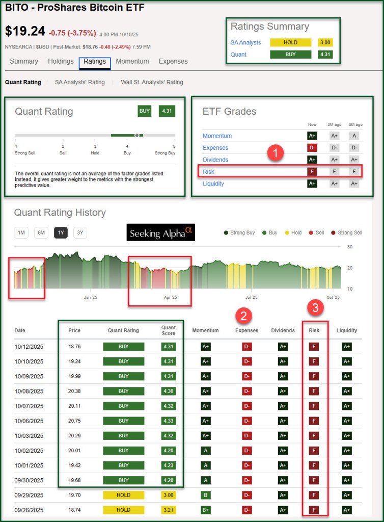 Secondly, prudent investors use a tool like Seeking Alpha as a part of their research. I want to read what others are saying, and I always consider the QUANT ratio. In general, but not always, I want to see at least a “HOLD” QUANT rating on any stock or ETF I add to our portfolio. BITO currently has a buy QUANT rating of 4.31.