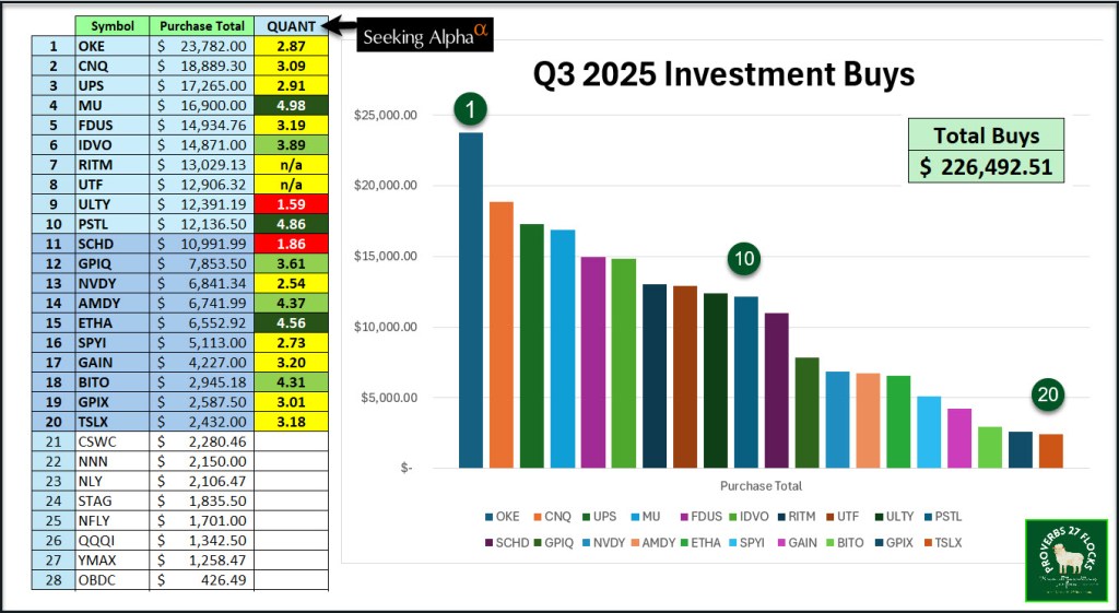 Remember our total portfolio size? All of the Q3 investment buys make up 6.7% of our total portfolio. I’d rather have these investments than any bonds or bond funds. Most of them generate significant income because they engage in high-risk behaviors related to options trading or cryptocurrencies.