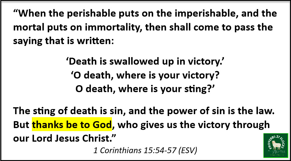 “When the perishable puts on the imperishable, and the mortal puts on immortality, then shall come to pass the saying that is written: ‘Death is swallowed up in victory.’ ‘O death, where is your victory? O death, where is your sting?’ The sting of death is sin, and the power of sin is the law. But thanks be to God, who gives us the victory through our Lord Jesus Christ.” – 1 Corinthians 15:54-57