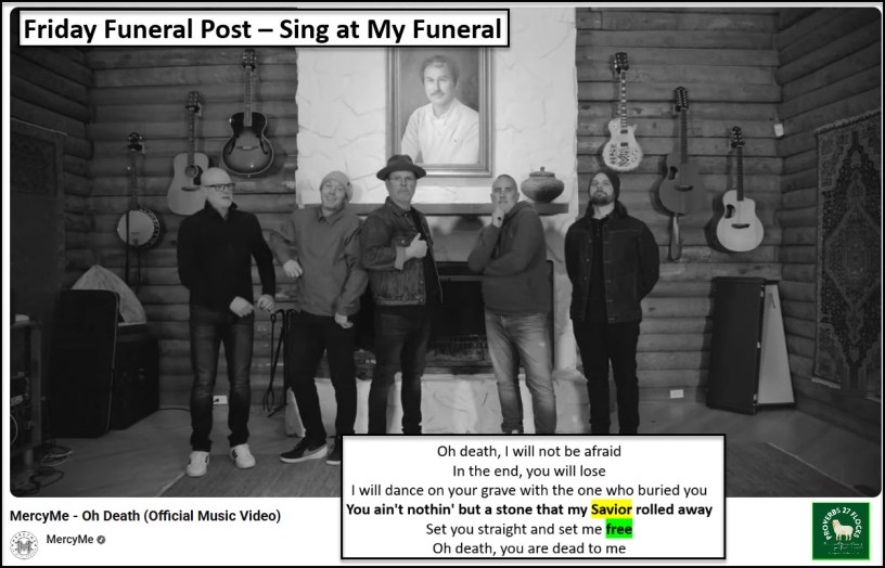 The host of the Five-Minute Friday will be taking a break from offering the weekly word I have used to create many of my Friday blog posts. That pause in her Friday word suggestions prompted me to go in a different direction with the Friday post. I would like to call it the “Friday Funeral” series. If I’m around on future Fridays I plan to write some more. This time I want to talk about some songs.