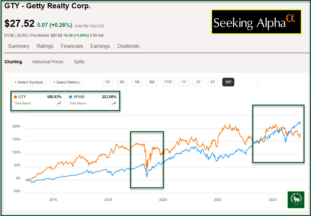 Seeking Alpha also makes it possible to graph total returns. Total returns are the price increase (or decrease) and the dividends paid during that period of time. GTY’s total returns are more than adequate. It doesn’t hurt to buy on the dips.
