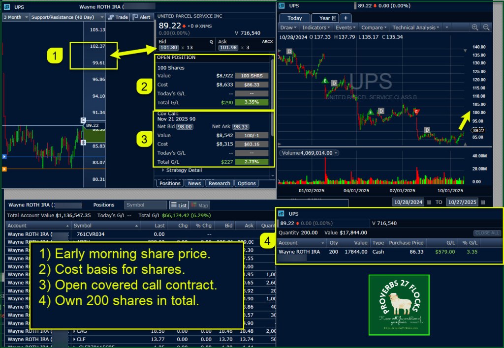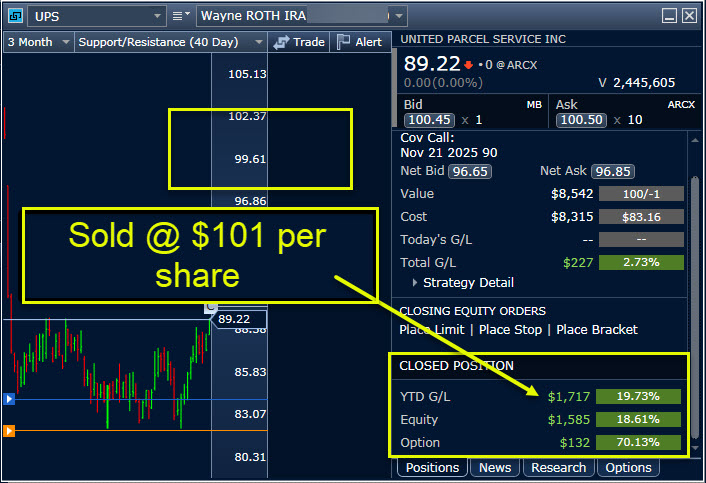 My profit isn’t limited to the $90 price. I have already received $185 from the options contracts I entered for UPS since I bought the first 100 shares. This includes a cash covered put that expired. If I can hold onto the shares in the covered call contract I can potentially earn even more options income from covered calls.