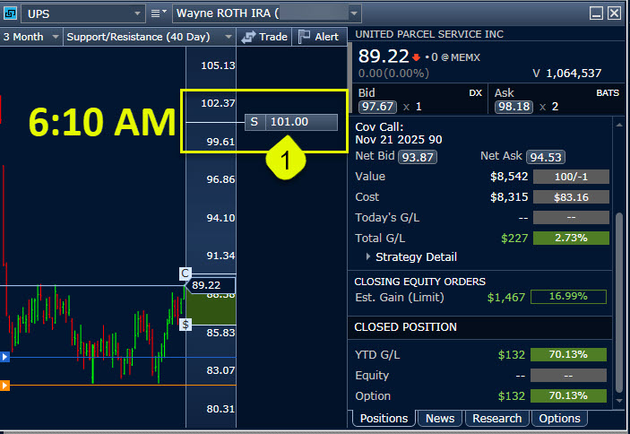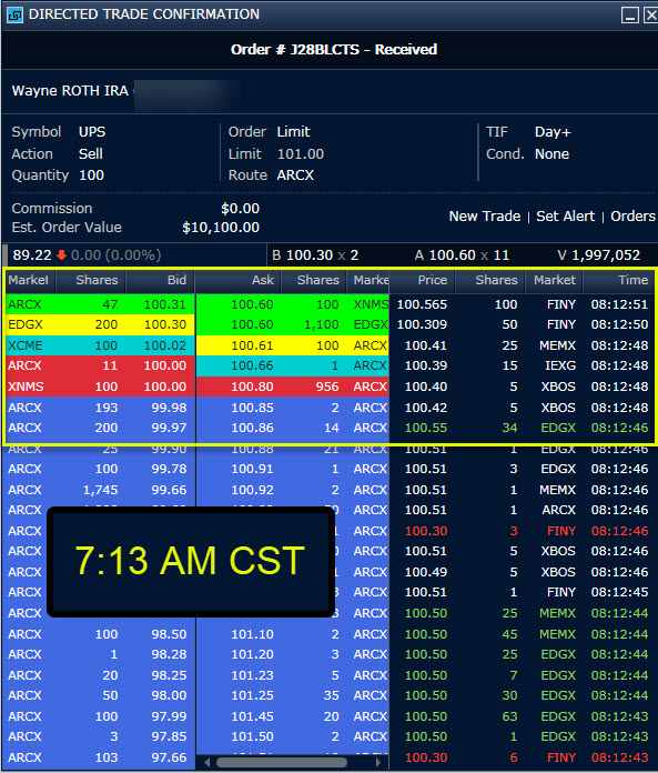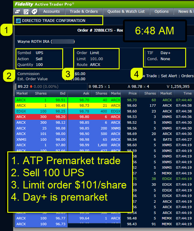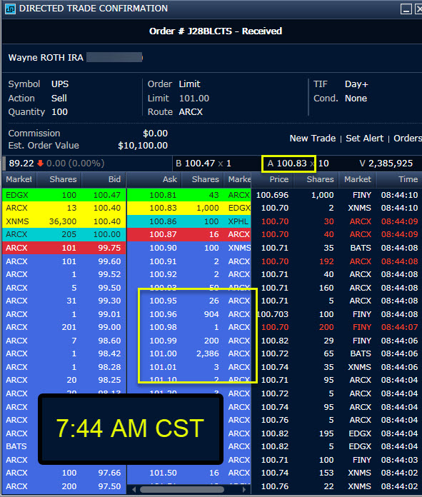 The ATP (Active Trader Pro) screen shots show why my patience was rewarded. There were a couple of times when I thought about lowering my sell limit price to $100 or even $97 per share. However, I was hoping that as more investors saw the good news they would bid up the price. They did and I sold 100 of my UPS shares before the market opened.