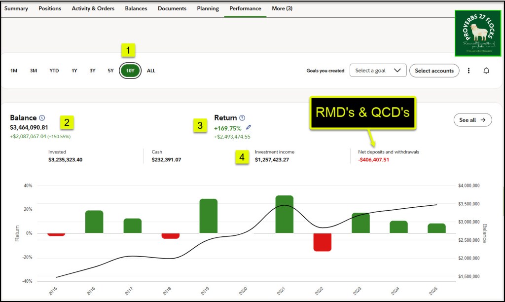 If you use the tool, be concerned about long-term results. If you have ten years of history, that is ideal, but don’t wait until you have ten years of history. The performance tool gives you insight into your “Time-weighted rate of return (pre-tax)” Fidelity says, “This measures your cumulative investment performance for the time period specified. It reflects any growth and income generated by your investments, net of fees. It does not reflect the impact of cash flows, such as deposits and withdrawals. Please see important disclosures below for additional details on our methodology.”