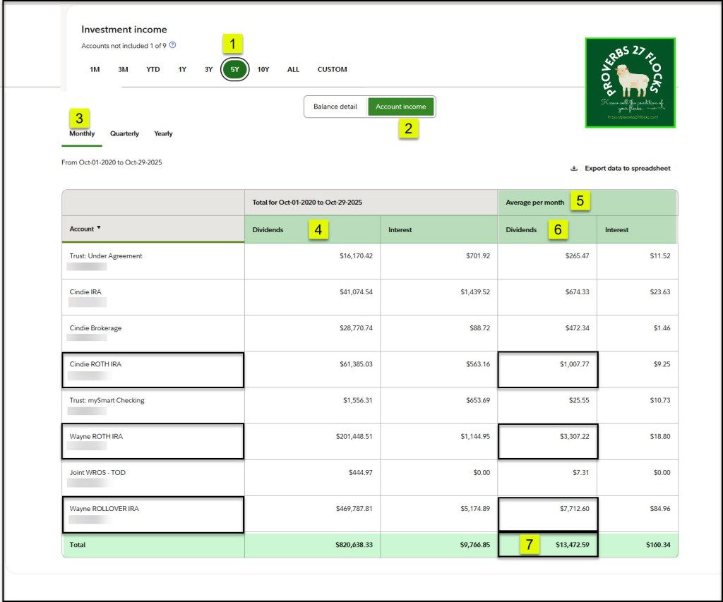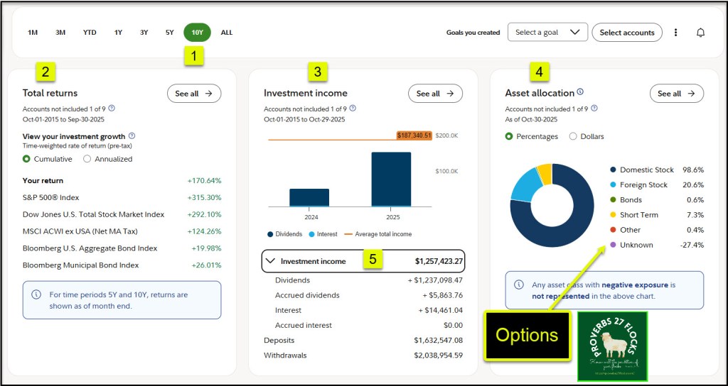 The tool also displays your total returns and your investment income and investment income trends. It reveals your asset allocations and some helpful analysis of your investment flocks and herds. Here are just a couple of samples. You can drill into the details as well.