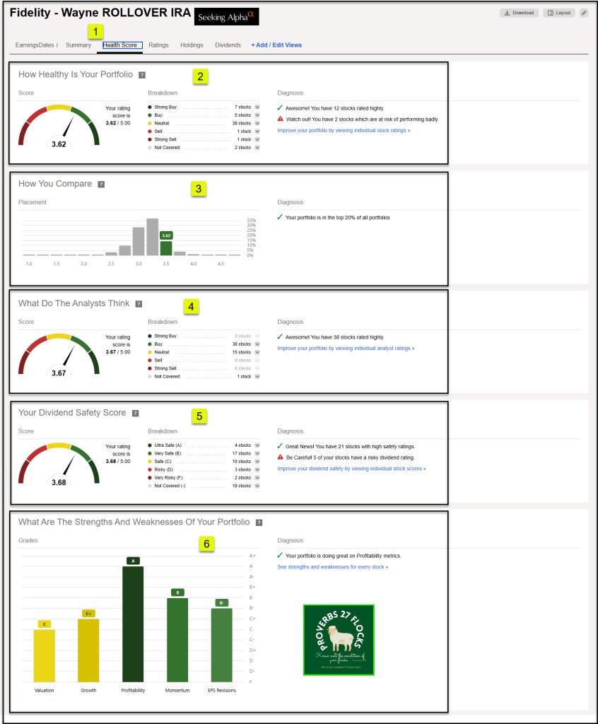 If you are comfortable with linking your brokerage account with Seeking Alpha, then you can get a nice high-level view of the quality of your investment herd and flock. This tool (1) reveals the following: 2) How Healthy is Your Portfolio; 3) How You Compare with others (my portfolio is in the top 20% of all portfolios on Seeking Alpha; 4) What Do The Analysts Think (I have 38 stocks rated highly in my traditional IRA account.); 5) Your Dividend Safety Score (This alerts me to both the good, the bad, and the potentially ugly income streams); and 6) What Are The Strengths And Weaknesses Of Your Portfolio.