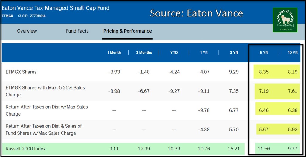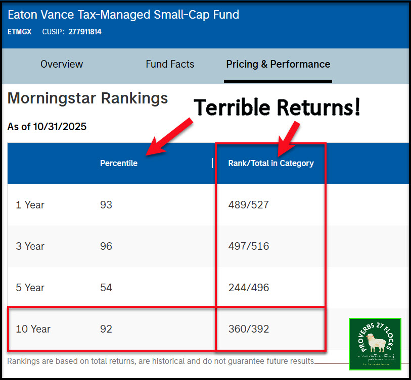 Even better is VIOV. Vanguard S&P Small-Cap 600 Value Index Fund ETF Shares has a 0.10% expense ratio, no loads, and a ten-year total return of about 130%. Why would anyone want to invest in ETMGX? Actually, most people don’t. ETMGX only has $116M in total assets. Most investors avoid it like the bubonic plague. One way to determine if a fund is a rational choice (mutual fund or ETF) is the total assets under management (AUM). If the number is less than a billion dollars, it probably is a fund to avoid.