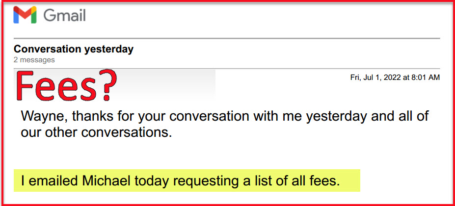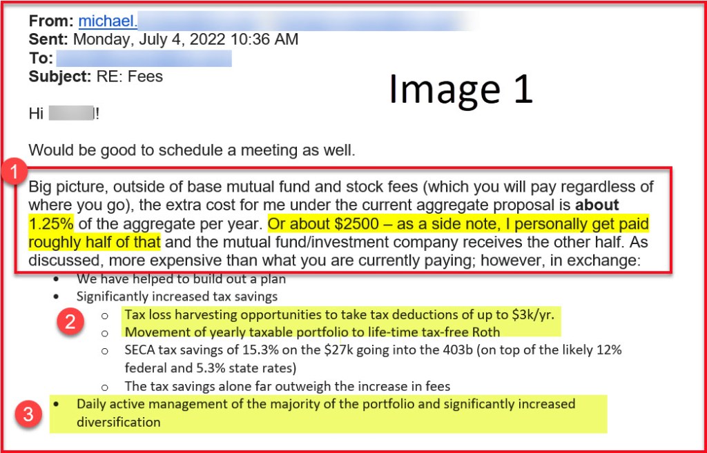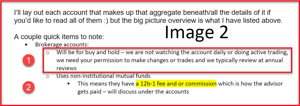 BIC Michael says brokerage accounts will be for “buy and hold.” He wasn’t going to be watching this account, so he has selective oversight and not a view for the big picture. Note that he does not specify the actual costs of the “non-institutional mutual funds” but does acknowledge that there are fees and commissions which he discusses later in the email. This is how “the advisor gets paid.” Sadly, the advisor is already receiving income from the account management piece of $2,500 per year. This type of double-billing is quite common, and it adds up over time.