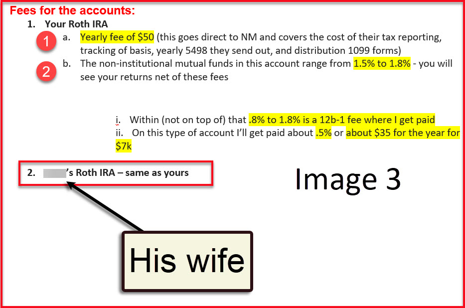 To add insult to injury, there is another $35 per year fee for $7,000 invested. The same is true for Bob’s wife. Therefore, the total is $70 per year or at least $700 for ten years. This assumes, of course, that the balances in the ROTH IRAs stay at $7,000. If they do that, why is Bob paying almost $2,000 over ten years for these services?