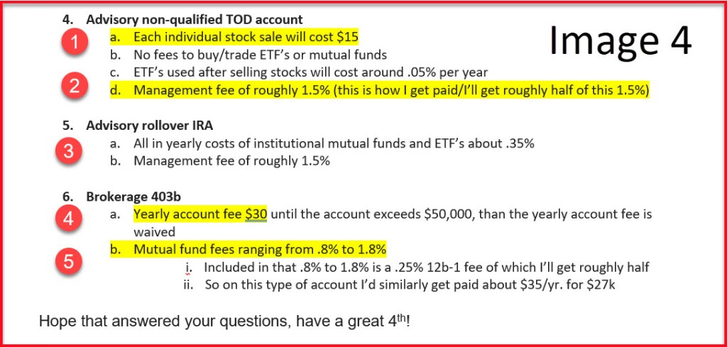 I don’t want to spend much time on this one, other than to say that charging $15 to sell (or buy) a stock is not only irrational, but also an open door for too much trade activity for multiple $15 commissions. Fidelity charges nothing to buy or sell any stock if you enter the buy or sell order on your own. This is not hard to do.