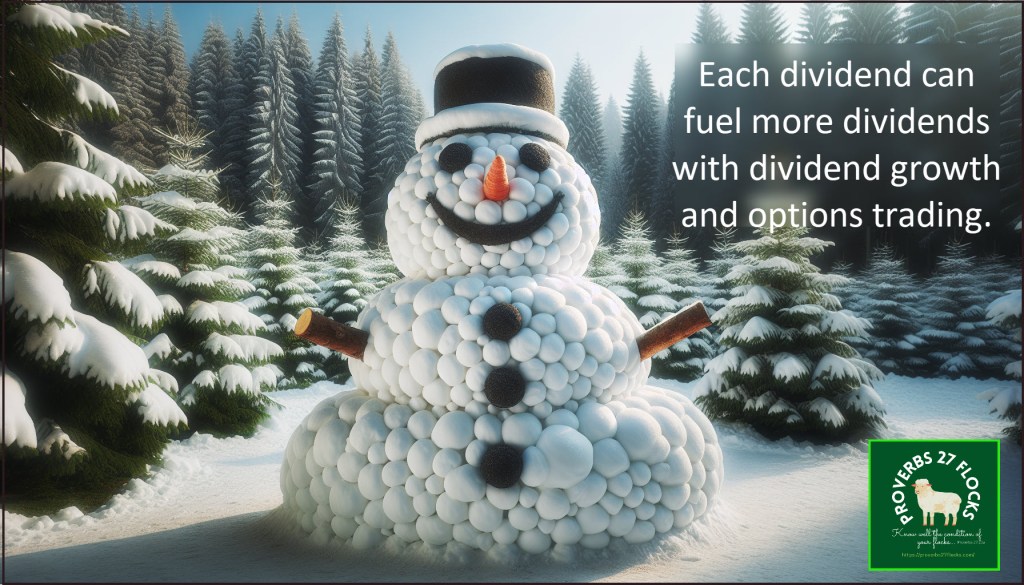 Dividend reinvestment creates a snowball of increasing dividends each quarter that builds a bigger dividend snowman. As the new shares are added they start to contribute to the next quarter’s dividend income. If the dividend increases, that increases the dollars available to continue to roll into even more income. Notice that in the down market the dividends still increased in 2022.