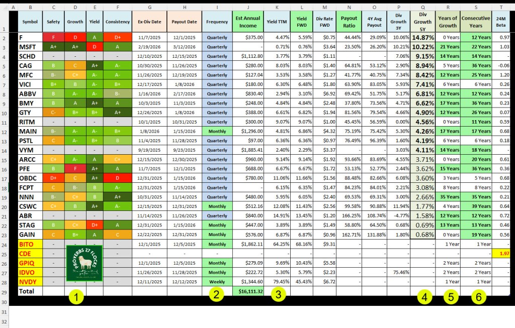 I also want to know the frequency of the dividend (2) and the yield (3). Although I did not label column N, the Payout Ratio, that value is also an important consideration. However, for the purposes of this chapter, the 5-year dividend growth rate is most helpful (4). Thirteen of her holdings have a growth rate of at least four percent. Remember: inflation eats into your spending power, so having a growth rate that exceeds inflation helps maintain your buying power.