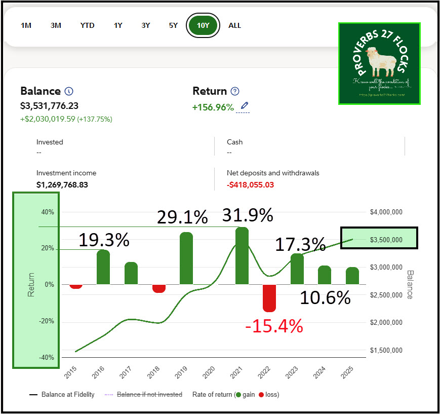 The following image from Fidelity illustrates my point about a dividend growth approach. The last ten years (plus YTD 2025) have had peaks and valleys. In four of the years our returns exceeded 17%. Three of the remaining years had acceptable returns of about or a bit more than 10%. The worst year was 2022 at a negative 15.4%. 2015, 2018, and 2020 were all slightly down. This is to be expected. The stock market is characterized by ups and downs.