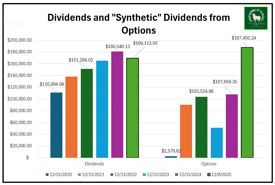 There are two pieces of income in Cindie’s ROTH: dividends and options income. $13,917 has been paid in dividends in 2025 YTD. The other piece is the “synthetic dividend” which comes from options trades. YTD options income is $4,850. Bear in mind that this income is all tax-free. $18,767 is a nice chunk of change for Cindie. This equals a “yield” on the total value of her account of about 6.3%.