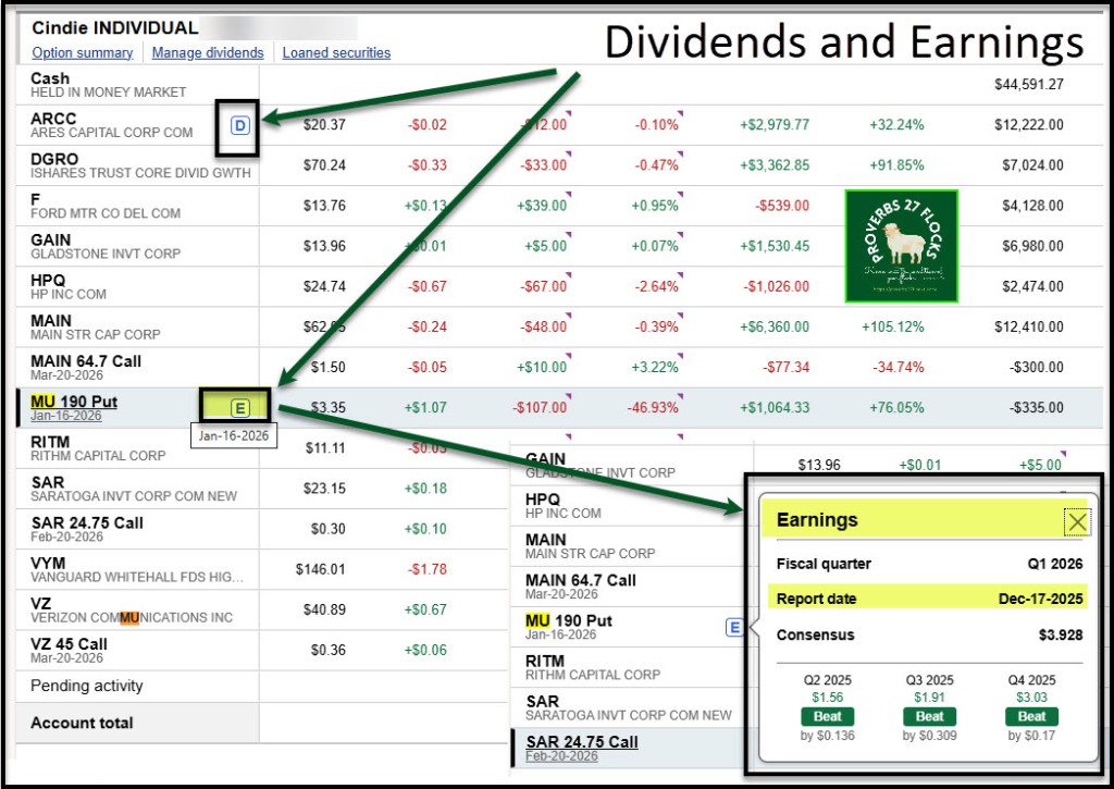 Fidelity also flags positions with a “D” for dividends. If you click on the “D” you can see the Ex-dividend Date, the Pay Date, the dividend amount per share, and the Estimated Annual Income for that position. When I do this for BCSF in my ROTH IRA, I can see that BCSF has an Ex-Dividend Date of December 16, a Pay Date of December 30, a dividend of $0.42 per share, and an estimated annual income of $1,800 on my 1,000 shares.