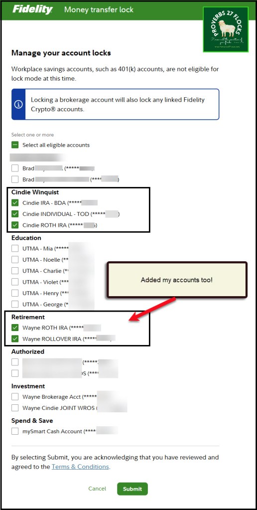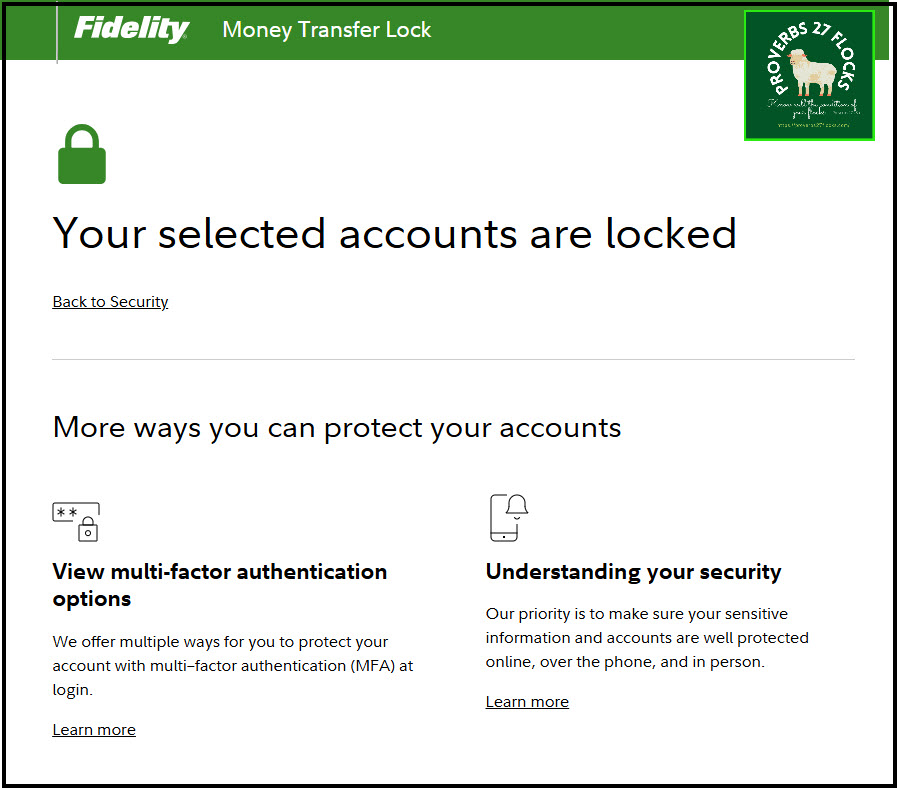Today I added another level of security to the five Fidelity Investment’s accounts that make up the majority of our retirement assets. These included three of Cindie’s accounts and two of mine. This chapter will explore my recommendations for layers of protection.