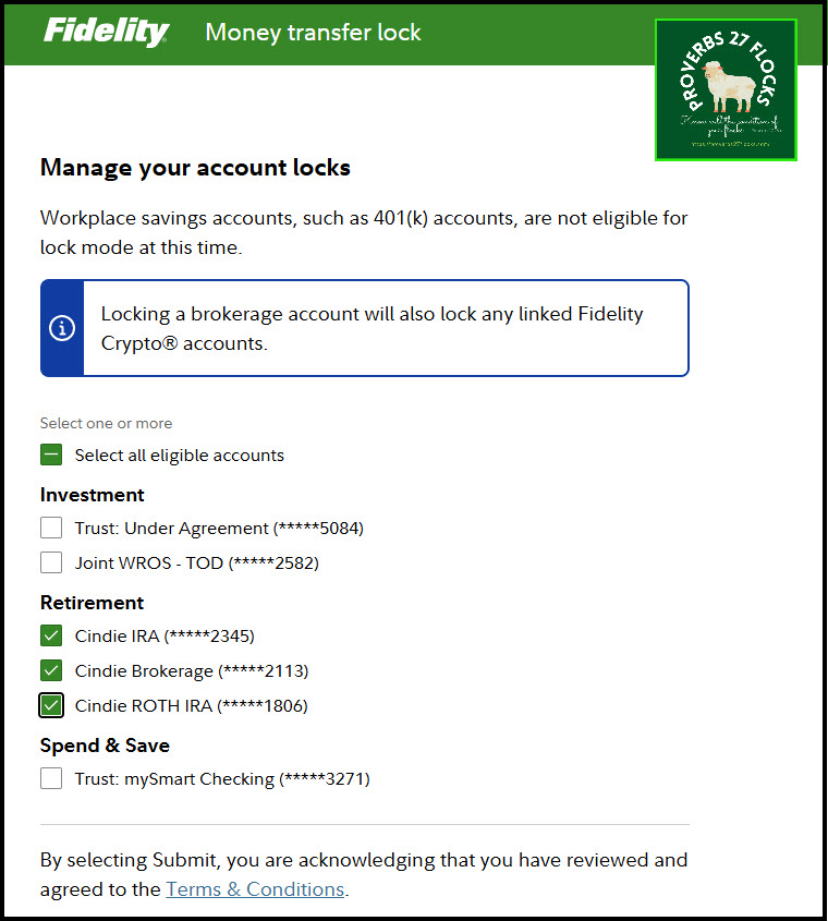 On Fidelity you should also enable Multi-factor authentication at login. Fidelity understands that adding an extra step might seem challenging. Therefore, they offer you the option to trust your device at login. Please ensure this device is exclusively used by you to maintain its security. I do this with my laptop to avoid the extra steps each time I log into our accounts.