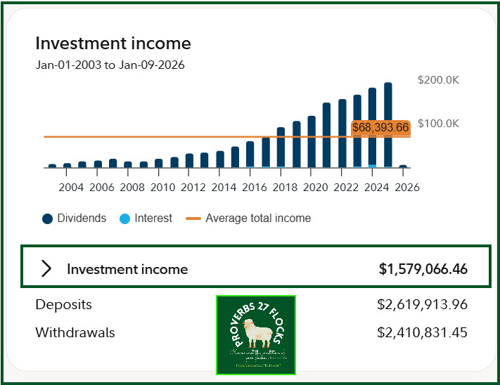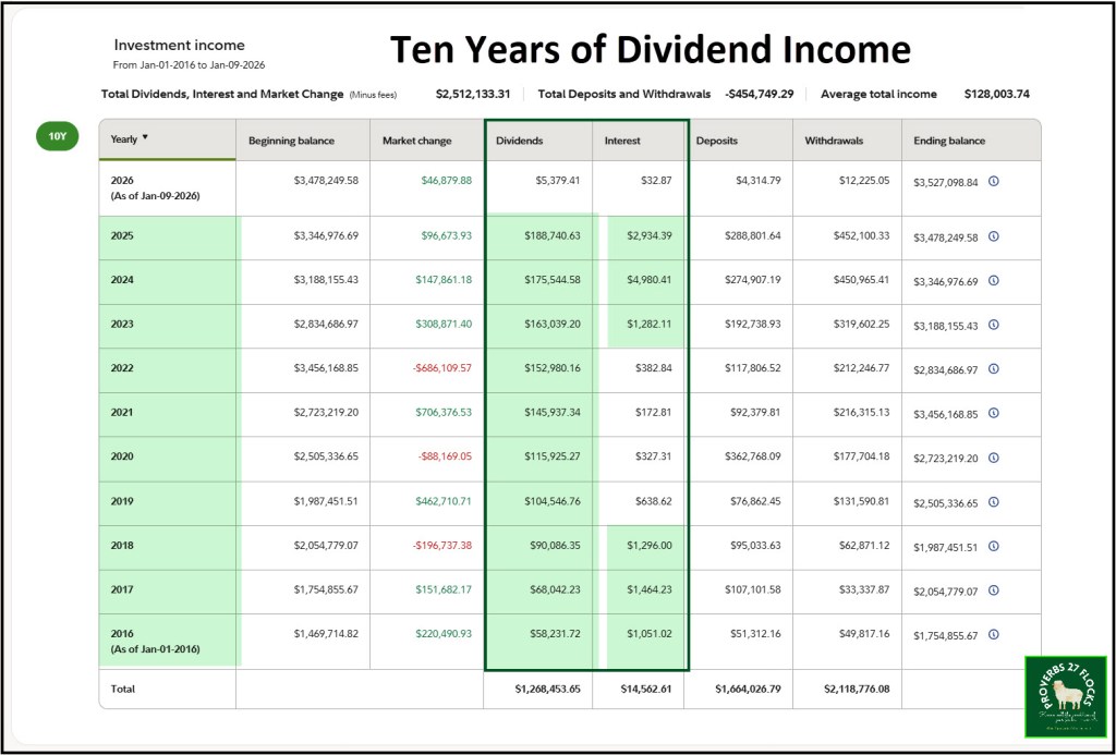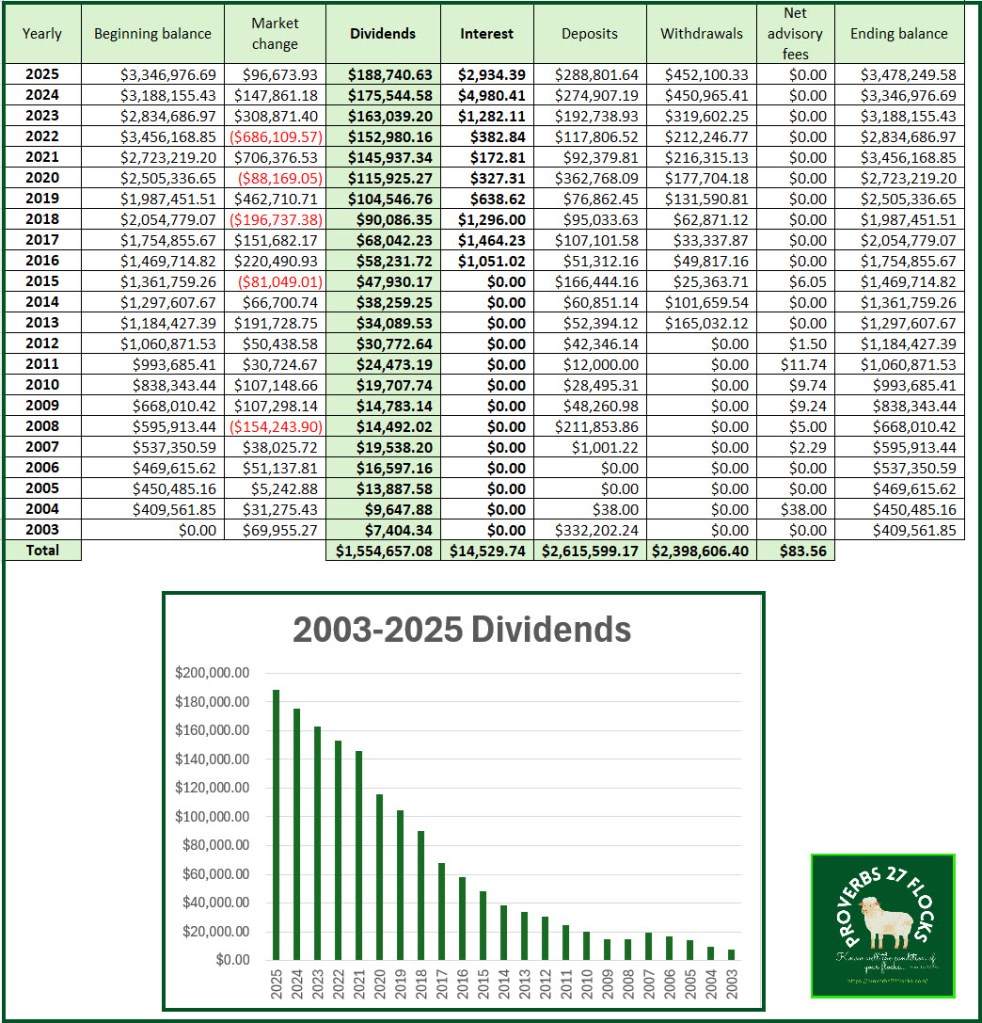 To put this in perspective, our income increased by 9.4% in 2024 and 6.2% in 2025. This was not done to sacrifice portfolio growth. The actual total balance of our investments did not grow significantly in 2025, but that is due to the withdrawals we made for various reasons, including QCD giving and the required minimum distributions we must take from our traditional IRA accounts.
