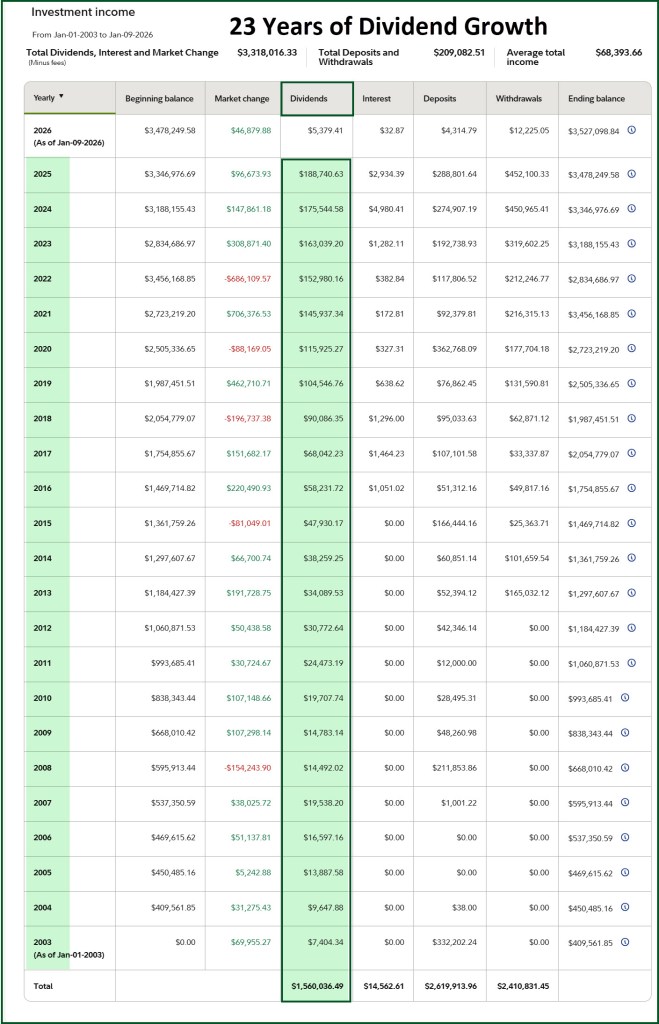 The second pipeline is far more lucrative and grows at a faster rate than Social Security’s measly 2% inflation bump. That pipeline is filled with dividend growth stocks and ETFs. One way to measure the success of a strategy is to see if it works. In 2023 our total dividends were just shy of $165K. At the end of 2024 our dividends increased to $180.5K. For the year that just ended, we reached a total of $191.7K in dividends (and interest.)