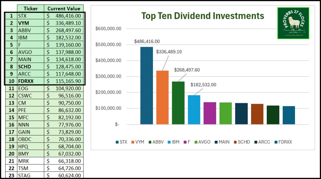 Our top ten investments are STX, VYM, ABBV, IBM, F, AVGO, MAIN, SCHD, ARCC, and FDRXX. I am not recommending any of these for your portfolio, other than VYM and SCHD. Those two are dividend growth ETFs.